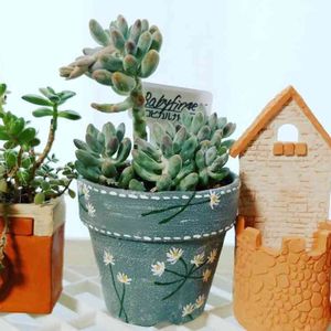 もったいなくて土が入れられなくて しばらく飾ってあったaikoさん の可愛い小花柄のリメ鉢にベビーフィンガーを植えました。😊 大房のベビーフィンガーの枝分かれしているのをチョンパしてさしただけですが、なんだか鉢とぴったり❗😆💕 ♡ テラコッタ鉢と並べて記念撮影!📸