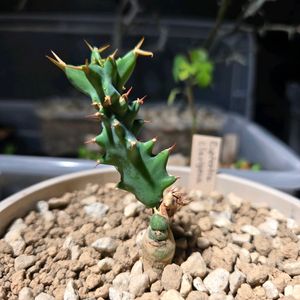 ■Euphorbia gottlebei ・トウダイグサ科ユーフォルビア属/マダガスカル原産 ゴッドレベイ交配種。年々少しずつ大きくなっているような気がします。今日も朝から暑い🌞 最高気温35℃、最低気温25℃ (以下、多肉植物全書より) ◯ユーフォルビア属 本属は2,000以上の種を包含し、海岸、常緑乾燥林、砂漠から熱帯雨林まで、環境を異にする世界中の様々な地域に分布する。タイにもユーフォルビア・アンティクオルムに代表されるタイ産の数多くのユーフォルビアがあるが、インド産のユーフォルビア・ネリーフォリアやアフリカ産のユーフォルビア・チリカルリ、マダガスカル島産のユーフォルビア・ミリーのように、古くから栽培されてきたためにタイ産の植物であると誤って認識されているユーフォルビアも多い。 本属の構成種の分類については、形態学的な形態分析に加えて分子生物学の技術を用いた分類が行われた結果、他属との統廃合が行われ、現在はモナデニウム、ペディランタス、シナデニウムがユーフォルビア属に編入されている。