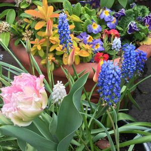 続けて投稿します🙏 ① チューリップ🌷第1号✨昨日はいつの間にかパッカーンなチューリップ ダブルでしたが今日は閉じてる☺️ 2023から植えっぱなしの白ピンク紫の3色混合球根ですがこれは紫かな🤔 やはり植えっぱなしは最初より咲きづらいですね😅 違う場所にも同じ紫の🌷が咲いています✨ ② 昔からいるクリーム色のチューリップ🌷 ③ 黄色からサーモンピンクへ変化するバタフライ スイセン ピンクワンダー🩷2日前は真ん中が黄色だったけれど今日はサーモンピンク🥰 ④ 八重咲きスイセン ホワイトライオン🦁 風でヨボヨボ〜勘弁して🥹5/2撮影