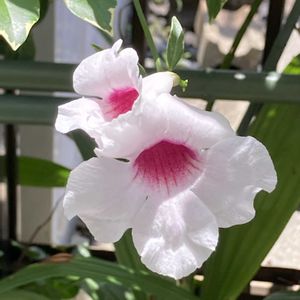 パンドレア斑入りと言います。 ピンクのお花が咲くと聞いたのですが2年たってツルも4メートル近く伸びてやっと1輪咲きました🌸 ノウゼンカズラ科だそうです。