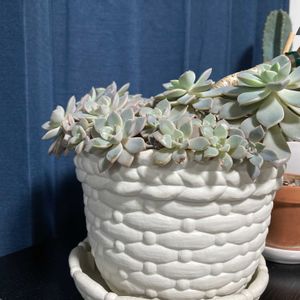 おはようございます☀😊 先月、ピンクプリティーの素焼き鉢が真っ二つに割れていました(꒪꒫꒪")ガーン 落ちたとかじゃなくて、その場でパカッと。ヒビでもあったのかも🥺💧 で。たまたま白牡丹の鉢に1ヶ所、バラバラ事件で隙間が出来たままだったので、首長族のピンクプリティーだけ挿しておいたもの( *´艸`)❤ 小さめの子達は転がって落ちていたので😢、養生スペースに植え直して春まで出番待ちにしました。 この首長族ピンクプリティーは、春にまた植え直します。 白牡丹はお水控えめ、ピンクプリティーはお水大好き😊 なので春からは相性良くないので、今だけの期間限定同居💡 そろそろ暖かい日も増えてきたので、同居解消前に記念に撮ってみたꉂ🤭 可愛いんだけどね〜❤