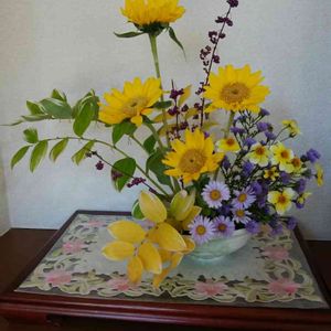 頂き物の季節はずれの向日葵🌻 お庭のお花と一緒に生けました 鳴子百合🌿 孔雀草💜 ウィンターコスモス💛