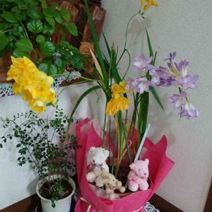 今日のお花🌼 フリージア💛💛💜💜 去年の秋植えの球根から 今年の3月に咲きました😄💛💜