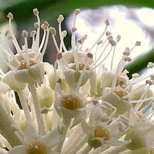 ヤツデ 白い雪洞のような花が、円錐状に伸びる 今日のGSの花゜。 ҉ ☃ 雄しべがよく伸びた両性花は、咲き進むに従って花弁や雄しべが落ちて、雌しべの花柱がおまけのように残る(ง˙∇˙)ว 蜜を求めてアリが集まってます♬ 12月も後半になると、花序の小枝についている花も咲いてくるけれど、大概は雌しべが伸びぬままに落ちていく‥‥ それは明確に「雄花」として元々生まれたのではなく、雄性期で終わった、バックアップ部隊の意味があったのだとと思います(^_-) 天狗の団扇と呼ばれる大きな葉は、中央から左右対称に裂けているから、八つじゃなくて奇数よね💚