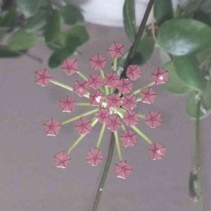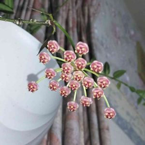 ホヤ ダイニングの窓辺に吊るしているホヤ。お花が次々と咲いています。 お花が咲くと、蜜が出てきます。 この蜜がとても独特な匂いで、甘い発酵臭のような。。部屋を締めきって寝て、朝ダイニングに入ると匂いが広がっています。