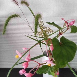 カヤツリグサとエノコログサ、秋海棠と一緒に花瓶に挿してみました🤗 庭では厄介者のキミ達だけど、こうして見てると癒やされるよ🌾🌸 昨日ダイソーで買った白い一輪挿しに。る