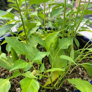 冬越しに失敗したとばかり思ってた島唐辛子🌶の鉢😅葉っぱが出てきてます😅💦ちなみに右のが同じ越冬組の島唐辛子🌶これは肥料のやりすぎ❓花はまだです😅