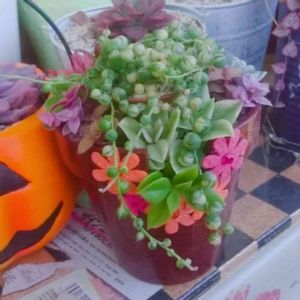 割れた鉢で寄せ植えしてみたよ😚👍✨✨✨給水ハウスも綺麗にペイントして飾りに再利用して、割れたかけらは階段みたいに❣️