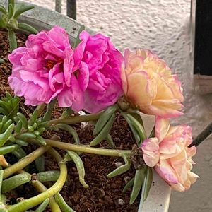 実家の花(o^^o)♪ マツバボタン八重とポーチュラカ マツバボタンの花言葉が「無邪気」ポーチュラカの花言葉が「いつも元気」‼️ 皆さん猛暑が続いてます😰無邪気はムリとして暑さに負けず元気にいきましょう😁 では仕事行ってきます🙋♂️💦