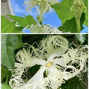 こんにちは☁ カラスウリ♡🐦⬛♡ 先週いつもの場所で開花しているのを見て、また少しカット✂️して 室内で開花ショーを楽しみました😉 ①朝6時過ぎ ②17時半 開花準備体制(笑) ③20時 花びらの内側にこんなに沢山のヒゲ?が…徐々に伸びてる感じ ④22時 綺麗なレース模様のお披露目😉 ⑤翌朝は綺麗に折り畳まれながら萎んで行きます不思議〜😳 🏷️白い水曜日 カラスウリの花言葉…男嫌い😁 夜に咲く美しい花に由来してるとの事です😆