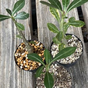 小さいアデニウムいろいろ。 ①ダイソニウムA 最初からのこの枝っぷり✨️ 後で見つけた 斑入り1枚だけ笑 ②ダイソニウムB これもなかなか。ヒョロんだけど 枝分かれしてるよ。なかなか。 ③小さい観葉コーナーのアデさんA 躊躇したけど1本は胴切り。 上下共に頑張ってます😊 ④小さいB。 こっちも育ったよ。ぶっとくて。 ⑤オマケ GS始めた頃かな。初めて買った憧れのアデニウム。 思い入れつよしクン。 毎年 綺麗な葉っぱをありがとう😊