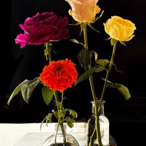 切花とハッピーマーブル(大) お花が5本で1000円ということで 見た目が立派な花を選びました。もう一本は別の花瓶です ハッピーマーブルは大きくなって 植え替え当時の葉っぱが1本だけ残ってます アジアンタム達は水やり係のパトロールの遅れにより 水切れさせて星にしてしまいました🎃 あ〃ぁー