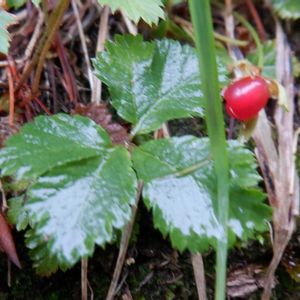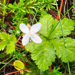 コガネイチゴ(黄金苺) バラ科キイチゴ属 灌木の下で真っ白な花が目立ちました🤍 亜高山の針葉樹林内や高山のハイマツの下などでみられる常緑多年草。 名は光沢のある赤い分果の形を小判に見立てたそうです。