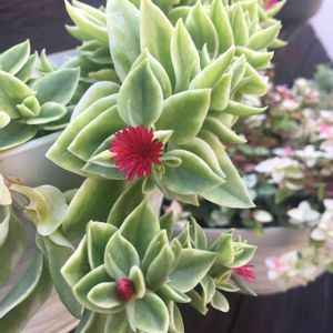 地元GS仲間のさば*さんから譲り受けた多肉さん。 ベビーサンローズ。 直径15mmぐらいのショッキングピンクの花がポツポツ咲いて可愛いです。 ウチで元からある1本のカット苗からチマチマ増やしていたベビサンと比べると立派なワサワサ♪