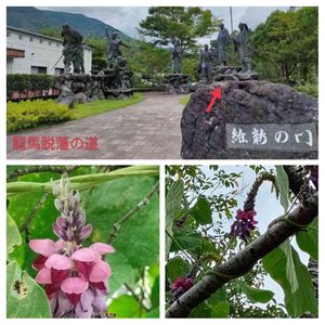 宇和島市から国道320号197号を通って 高知県梼原町に行きました 維新の門という銅像があります 龍馬と八人の仲間 (一人かぶってて写らなかった😆) 詳しくはネットでみてね 龍馬ファンが訪れる脱藩の道の 始まり ここから韮ヶ峠を越えて 愛媛県に入ります 肱川を船で下り大洲を通り 長浜にでて海路で山口県に 大洲の観光船の船頭さんが 龍馬は この場所で一度下船して 大洲で食事をしたという 船着き場を教えてくれました🛶 梼原町は脱藩の道のガイドとか トレッキングとかあります クズのお花がランチした お蕎麦屋さんに咲いていました🌸🌸🌿
