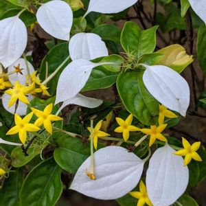 コンロンカ(崑崙花) ハンカチの花、ムッサエンダとも呼ばれる。 アカネ科コンロンカ属 熱帯アフリカ、熱帯アジア、太平洋諸島原産 白い葉(花弁)のようなものは萼片で、黄色い星型⭐が花。 ミズキ科のハンカチノキとは別物。 昨日GSで見た後散歩に出たら、なんと見つけたのです✨🤍✨💚✨