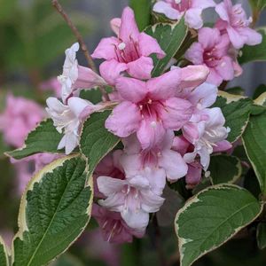 オオベニウツギ とグーグルレンズの回答です🔎 タニウツギとかハコネウツギにも似ていて、判断が難しいです。 斑入りオオベニウツギ バリエガータと教えていただきました!