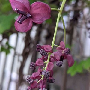 ミツバアケビの花 上の大きな花は雌花🙋♀️ 下の房状が雄花🙋♂️ 花弁に見えるのは萼で、雌花には雌しべが、雄花には葯があります。