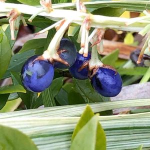 "ノシランを追っかけて" 雨☔️あがりの散歩で、色付いたノシランの実に、であいました。 ブルーがまだらです。 房にいっぱい実が付いているのはまだ色づいていませんでした。 納得いきません🤔 まだ追っかけ続きます。
