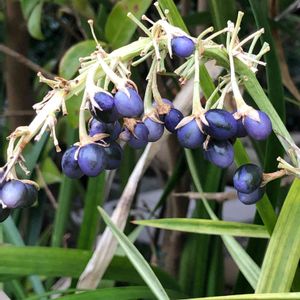 ノシランの実 大分色づいてきました。 もう一息❣️❣️ 房にたくさん実が付いています。 早く見たいなラピスラズリ色🔵