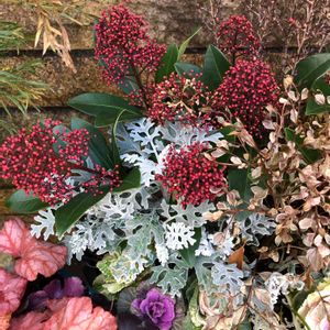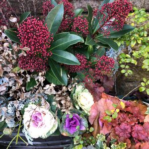 センスのいい寄せ植えに、ちょっと失敬してパチリ! お庭も素敵にガーデニングされていて、見習いたいです。 写真中央の赤いプチプチとした蕾の植物 何処かで見た花です。 ビバーナム ティヌスかな? 違ってました。 教えて頂きました。 ❤️スキミア❤️でした。