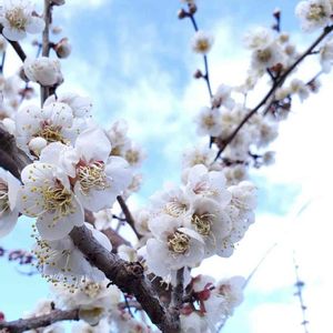 梅の花 隣の敷地にある梅畑の梅が一斉に開きだしました🎶 春のような日の空をバックに…🌥️