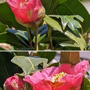 金魚葉椿🐠👣 ついに咲きました❤️ 11月に面白い形の葉👣を見つけ、金魚葉椿と教えていただきましたが、他の椿より開花が遅く、やっとです🥰