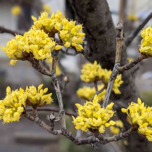 サンシュユ(山茱萸) ミズキ科 ミズキ属 中国原産 📝 葉より先に黄色い花をつけることから、ハルコガネバナ(春黄金花)と呼ばれる。 また、秋のグミのような赤い実をサンゴに例えて、アキサンゴ(秋珊瑚)とも呼ばれ、乾燥した果肉が生薬になる。