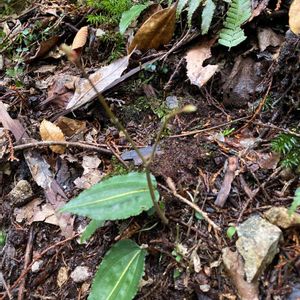 2020.3月 安芸太田巡り3週目の残り みんな分からなかった、この間の最後に見た葉っぱ。伸びた茎の先には花芽の様なものがついていました。 葉っぱの中央の黄色い筋が特徴的です。 イチヨウランかな?とか、ホトトギスかな?と言った声もありました。 答えの分からない宿題、教えて下さい。