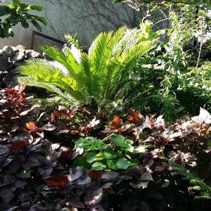 先程のソテツpicを韓国チェジュ島で暮らす妹にLINEで "懐かしくない?"って送ったら "これソテツだったんだ〜😮ウチの放置の庭のソテツ!" って送っきました。 ソテツも知らないみたいで😅💦 離れていてもこんなやり取りが出来るようになって… 母が生きていたらどんなに喜んだだろうなぁ〜😌 にしても色合いはいい感じだけどもしかして…赤じそ💦
