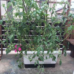 ビフォー♡ ヤマボウシを剪定した時の枝を支柱にしてイイ感じ〜と思っていたのも束の間😩 プチトマトがどんどん成長して大変な事に…😅 プランターでも結構大きくなるんですね💦😅
