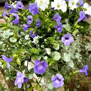 ずーっと以前から蔓延っているディコンドラ、端っこに寄せて、散髪✂️ 真ん中にトレニアカタリーナ、奥に小ぶりのペチュニアを寄せたら、爽やかな鉢植えになりました 🤍💜🍀