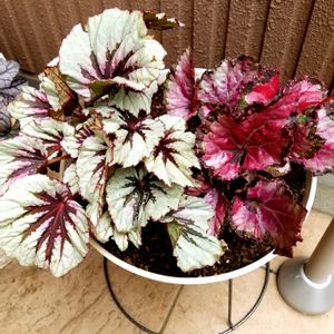 レックス・ベゴニア2種です。 うちの玄関は北向なので、日光が必要なお花は、あまり長い期間飾ることは出来ません。 明るい日陰で育つレックス・ベゴニアには、丁度良いかも知れません。 サイケデリックな模様がお気に入りです。