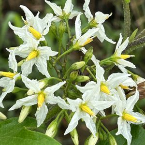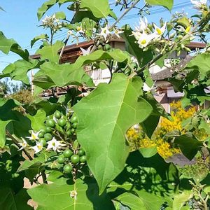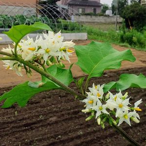 スズメナスビ 雀茄 1/2 ナス科 ナス属の常緑低木 ブラジル原産の帰化植物 日本では沖縄以南の道端や原野などに自生 沖縄の道端で コンクリートの隙間に生えてました。 何じゃコレ?!  お花もトゲも ワルナスビによーく似てるけど違うよね~  ワルナスビって こんなに背高くないもん。 とかなんとか ブツブツ独り言言いながら眺めてきました。 私が見つけたこのコは 私の胸元位 の背丈 120〜130cm位。 (ワルナスビは 40〜70cm) 樹高は日本では大きくても2m。タイなど東南アジアの地域では 5m位にもなるそうです。 ゼンゼンサイズが違います。 枝や 葉裏には 7mm程の大きくしっかりした凄いトゲがあります。 葉っぱは 10-20cm (イヤイヤもっと大きく感じたなー) 縁は波状。 集散状に 2〜3cmの白色(青紫色もある) の お花をつけ 通年開花するそう。 果実は 1cm程の球形で、いろんな写真見てると緑色の実をよく見かけますが 熟すると黄色〜橙色になります。 どうして熟す前の緑色の写真が多いか わかりました。 タイでは 香辛料として栽培され 果実は若いうちに収穫し 料理に使われるそう。(=マクアプアン) この すごみのある全身の姿から スズメナスビってお名前が どーにも結びつかなくって…  だって植物のお名前にスズメを使うのは 小さなものを表す場合が多いですよね。 ま、勝手に命名するとしたら…  ナンバンオニワルナスビ 南蛮鬼悪茄子 ってとこかな。 (↑ ワルナスビに似てるけど、毒はないから “悪”ははぶこうかな。)      ぷぷぷっ ジョーダン お名前の由来は 雀の卵ほどの小さな 果実 だからとのことです。 なるほどねぇ  撮影 2023 3/21 スマホ 沖縄 バス通り沿い道端