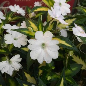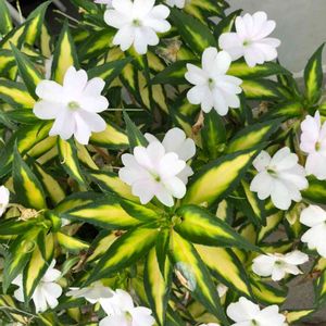 サカタのタネのサンパチェンス ✨🤍スプラッシュホワイト🤍✨ 斑入りの葉っぱが爽やかで、白いお花は薄らピンクがかって、お日様浴びると光沢があります🤍✨((( (づдˊ)*マ、マブシイ~✩