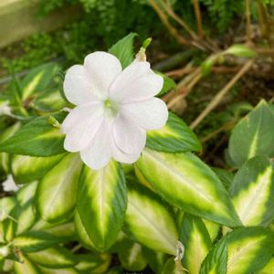 サンパチェンス スプラッシュホワイト🌸限定商品ですが、近所のHCで見つけました。まるで観葉植物みたいな葉が美しい。