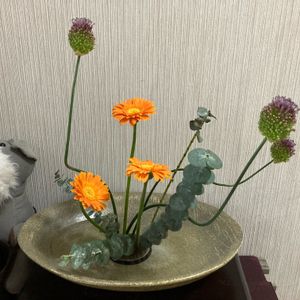 生け花、たまに生けるとこんな感じです。ガーベラ以外花材の名前がわからずでした。(娘の同好会のものでしたが何故か私が生けました。)