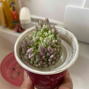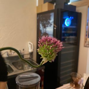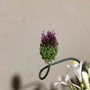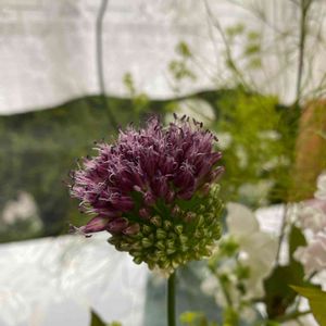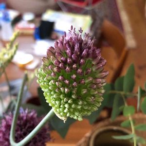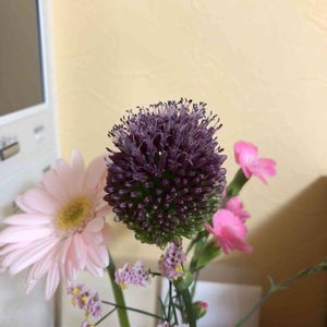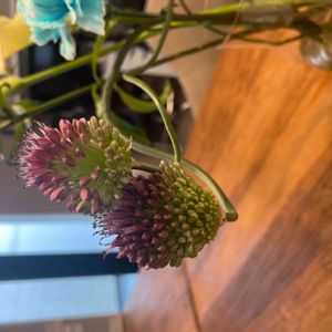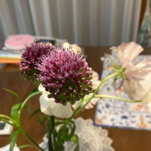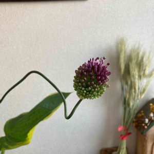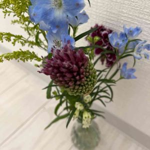 フラワーアレンジメント ベロニカ アリウム丹頂 アジサイ ローズマリー 葉牡丹 最近は大きな花束💐作りにはまっています😃 だいだい片手で持ちきれる量。今回はベロニカとアリウム丹頂を買ってきたので、庭のアジサイ、ローズマリー、葉牡丹と合わせました。 シックで好きな色合い‼️ そしてこのままドライに~👍