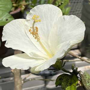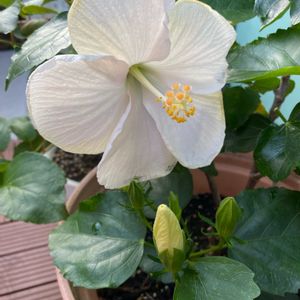 ハイビスカス🌺ピンクバタフライ 鉢スレスレのところに今年の1番花が咲きました🌺 お隣に白いハイビスカス🌺ガイアを並べて💕