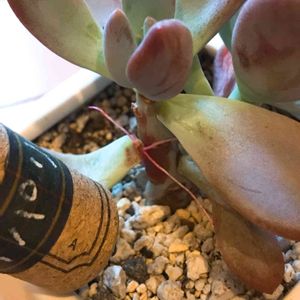 おはようございます☔️ 多肉植物 涼しくなってきたから葉挿しして増やしたい。と思い始めてました いつもは何気なく見てた多肉 「オパリナ」 今朝は葉が大きくなってるし 色もかわいいから1枚カットしよう。と思ったら 後ろ側で既に根が出てました! びっくりです すぐにもぎ取りました! (写真はもぎ取ったあと、こういう状態だった。と見てもらいたくて茎に寄り添わせた状態です) こういうこともあるんですね😲