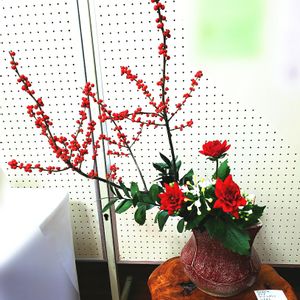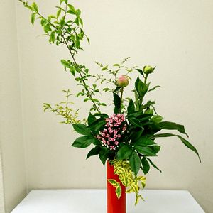5月に生けたものです。 ブバルディアとつぼみの芍薬とイボタン。真っ赤な花器も主役です。