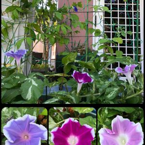コレ、ダイソーで 2袋100円の種。つるなし朝顔なんです🎶 確か…「ベランダミニ朝顔」という名前だったと思うけど… けっこう 花も 葉っぱも 普通サイズです👍 ⬆️ やっと 今日 3色咲いていました。 グリーンのカーテンにしているのは 「オキナワスズメウリ」 青い花が咲く「バタフライピー」💙は、ご近所さんにもらった種からです。