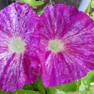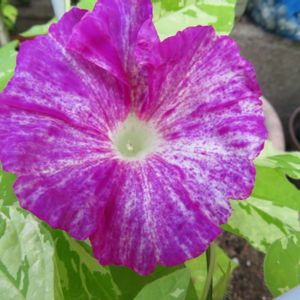 変化朝顔 江戸時代から続く変化朝顔、今尚新しい品種が愛好家・自然交配で生み出されています。 この朝顔は「くらしの植物苑(佐倉市)」で生み出された品種です。 正木系統 歴黄−1 黄斑入蝉葉紅吹掛絞丸咲大輪(吾妻絞)