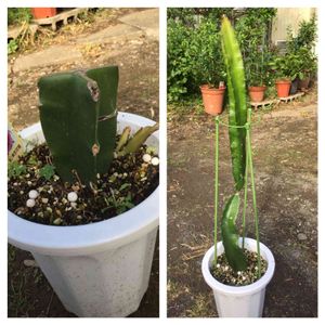 ドラゴンフルーツ(赤) 左の状態の物を春に購入! 脇芽がでてるのがわかりますか? 挿し芽して、大きく育ったのが右! 来年の夏位に、実がなればいいのだけれど! 月下美人に似た(ほぼ同じ)花が咲くみたいです。