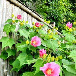 昨年春、GS友達に芙蓉の苗を頂きました〜。 今年は私の肩くらい大きくなって蕾が着きました〜。 どんな花が咲くのか楽しみです。 *ଘ(੭*ˊᵕˋ)੭* ੈ♡‧₊˚🌸