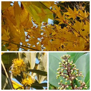 今日の庭 上 ポポー&モミジの葉 黄葉💛 左下 シロダモの花 右下 カラフルになってきた ミヤマシキミ