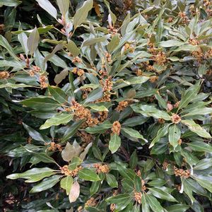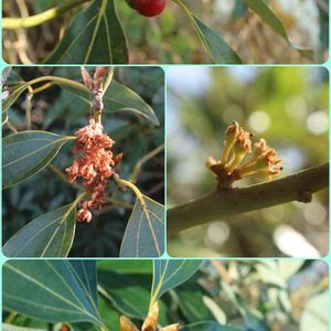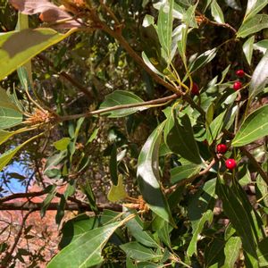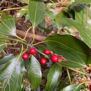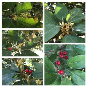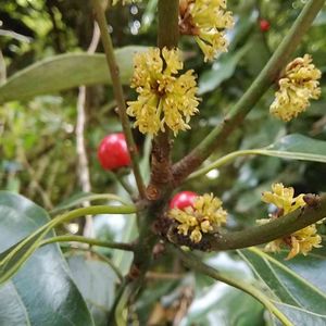見上げた先に可愛いお花が咲いて、 えっ⁈実もついているよ~❗️🫢 「シロダモ」白だも クスノキ科 別名・シロタブ、タマガラ オキノミノキ 開花は秋、10月~11月。 果実は長さ1.2~1.5cmの楕円形で翌年の秋に赤く熟すので、花と果実が同時に見られます。👏 〔シロダモの利用〕 材は建築材、器具材などに用いられます。 種子から採れる油は「つづ油」「つづ蝋」と呼ばれ、灯用油やロウソクの原料とされました。 秋に咲くお花と、昨年から時間をかけて 赤くなった実が初めて見れ…感激❣️😍