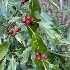 11/18 角田山 マユミ、コマユミだけでなく、里山は実りの季節。 ✌️✌️✌️😃😃😃✌️✌️✌️ ⬆️⬅️ ハマナスが咲く頃、白い花を咲かせる娘でしょう。名前は・・・思い出せない。シャリンバイ(車輪梅)バラ科シャリンバイ属の常緑低木、でした。 ➡️ コノ娘は知っています。まだ若い実です。来年の春に黒く熟します。キヅタ(木蔦)ウコギ科キヅタ属の常緑つる性木本。落葉性のツタ(ブドウ科)に対し、常緑性で冬でも葉が見られるのでフユヅタ(冬蔦)とも呼ばれる。 ⬇️ 赤い実、何でしょう。葉は記憶に有る様な、無い様な・・・。シロダモ(白梻)クスノキ科シロダモ属の常緑高木。別名はシロタブ、タマガヤ。『若葉は薄茶色の柔らかい毛にびっしりと覆われており、肌触りはふわふわです』白く見える姿は記憶に残っています。ヘ〜ソ〜なんだと、今更感心。花期は今頃なんですネ。写り込んでいる写真がないかと思ったけど、残念ながら有りませんでした。要リベンジ。 ✌️✌️✌️😃😃😃✌️✌️✌️ ⚽️ドイツに勝っちゃった🎉㊗️🎉