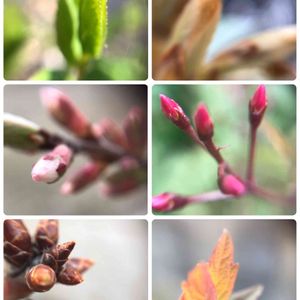 こんにちは😃 今日は風が寒い😨 我が家の新芽ちゃんたちのpicです 左上から時計回りで 姫うつぎ→シロダモ→羽衣ジャスミン→コデマリ→桜「旭山」→ゆすらうめ
