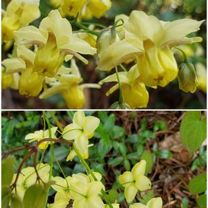 上から下から📸キバナイカリソウ。 薄紫のトキワイカリソウの花が終わって💚形の葉だらけになると咲いてくる。 こちらは碇⚓の部分が控え目で、色も優しいレモンイエロー。